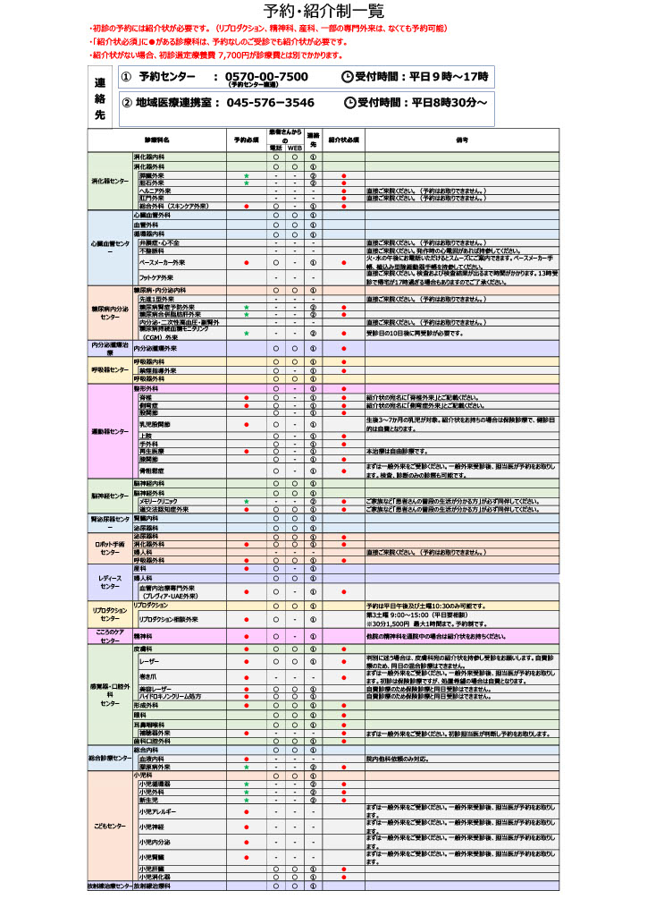 代表045-576-3000 または 地域医療連携室 ご希望の診療科をご指名ください |