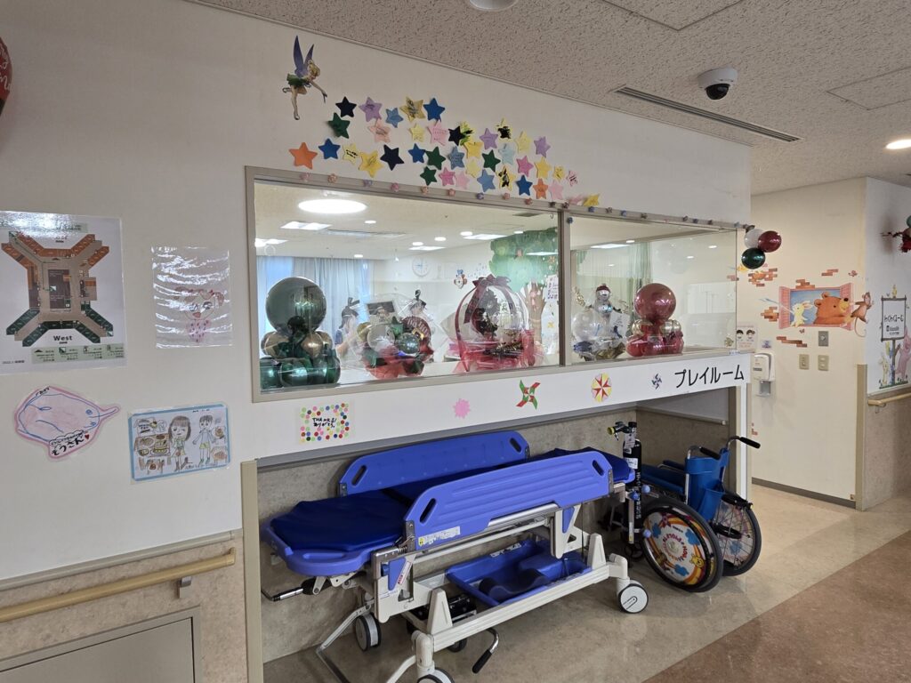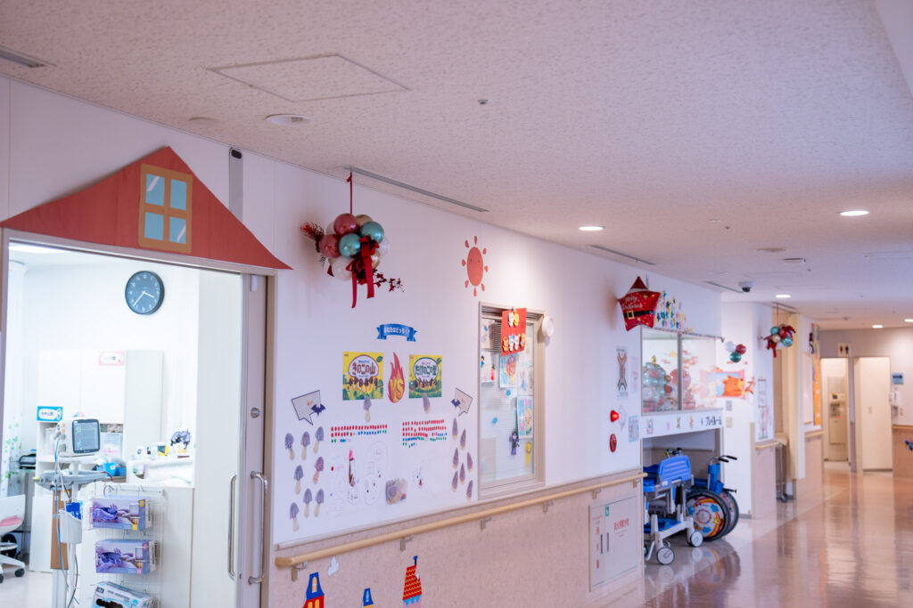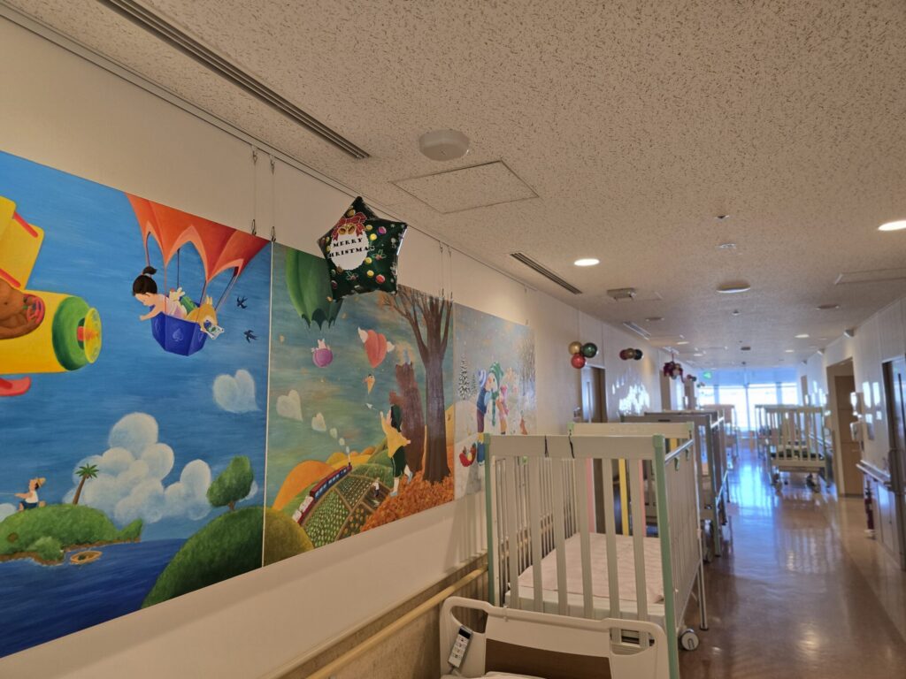 今回装飾がされている場所は、小児病棟の入口、各個室の入口天井、廊下、プレイルームの中、NICU/GCUの待合スペースなどです。
