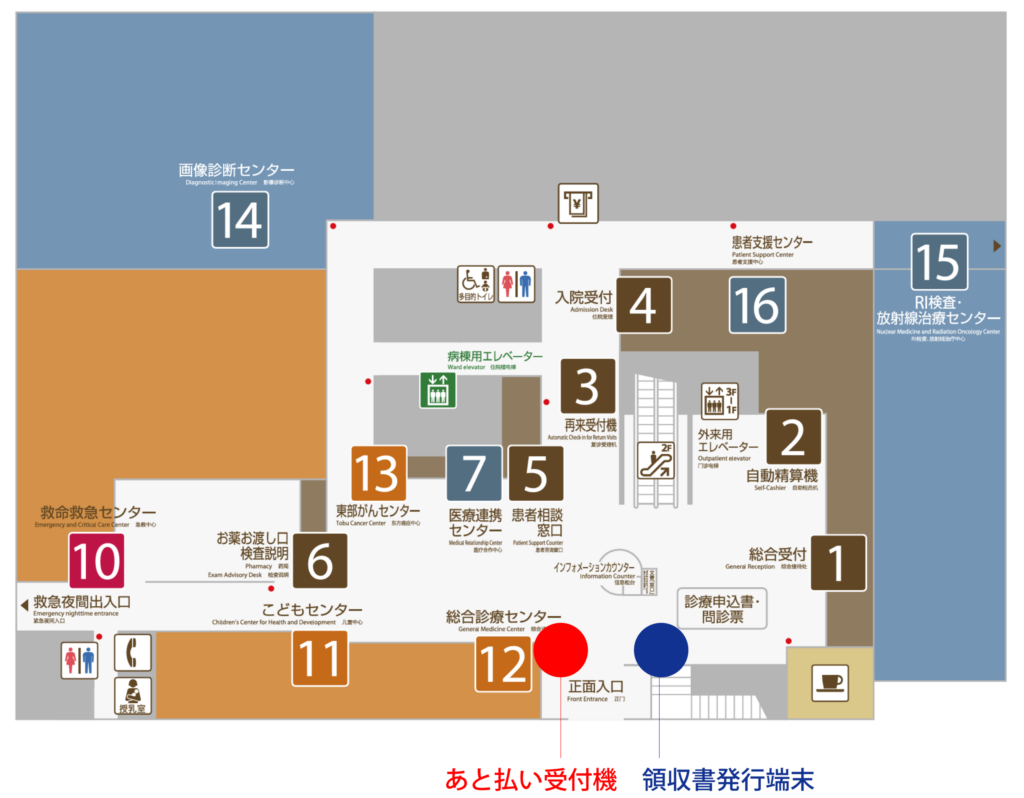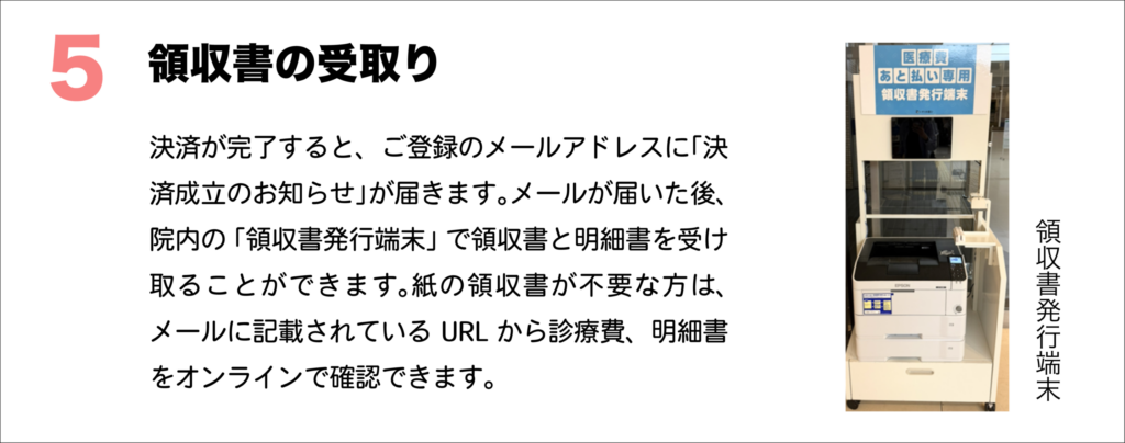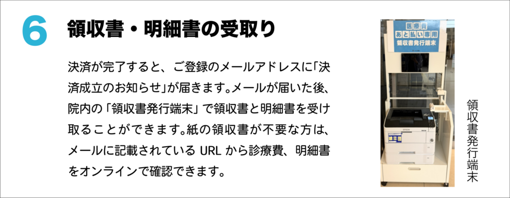 A.決済完了メールを受け取り後、院内の正面入り口付近に設置しております領収書発行端末から発行が可能でございます。発行可能な期間は請求日から2年となっておりますので、ご注意ください。紙の領収書が不要な場合は、決済完了メールに記載されているURLから、WEB上で領収書の確認が可能です。