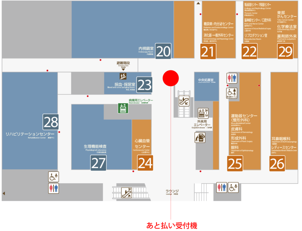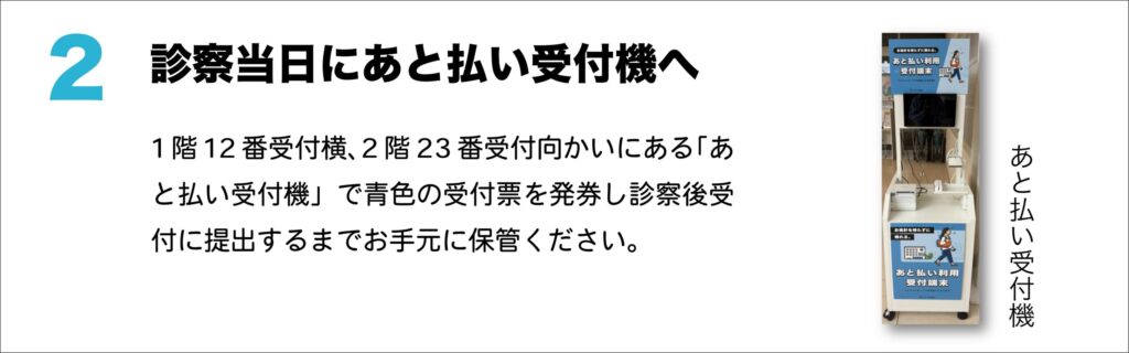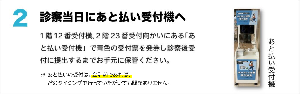 A.診療日当日のあと払い受付を行わなければ、通常の会計お手続きとなりますので、現金でお支払いいただけます。また、あと払い受付を行っても、診察日当日中に診療費を院内でお支払いされた場合は、「あと払い受付」は自動的に取り消されます。そのため、同じ診療費が二重に引き落とされることはありません。