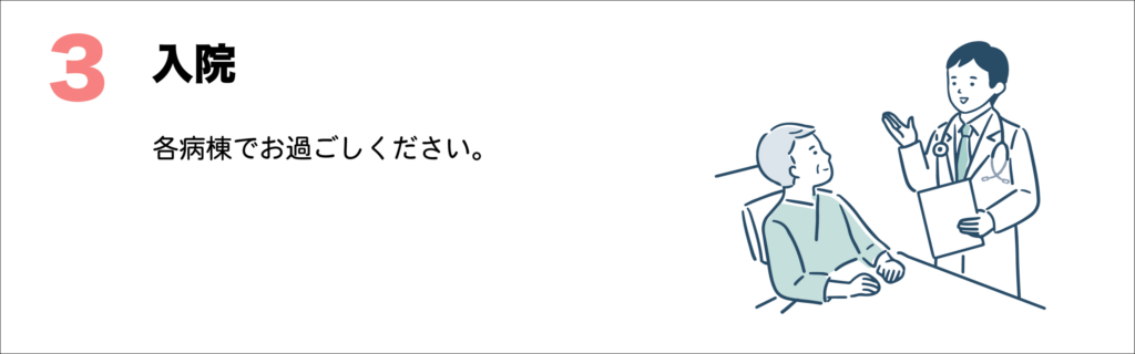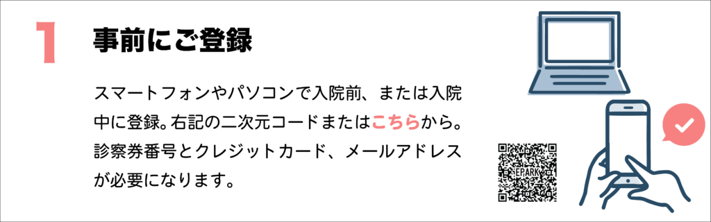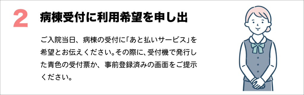 A.ご利用いただけます。ご入院日(またはご入院中)に、病棟事務スタッフへあと払い利用希望であることをお伝えいただき、青色の受付票か利用登録済みの画面をご提示ください。
