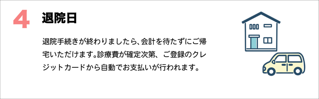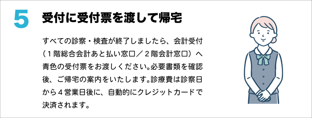 A.診察や検査が終わった後に、会計の待ち時間なく、ご帰宅いただけます。