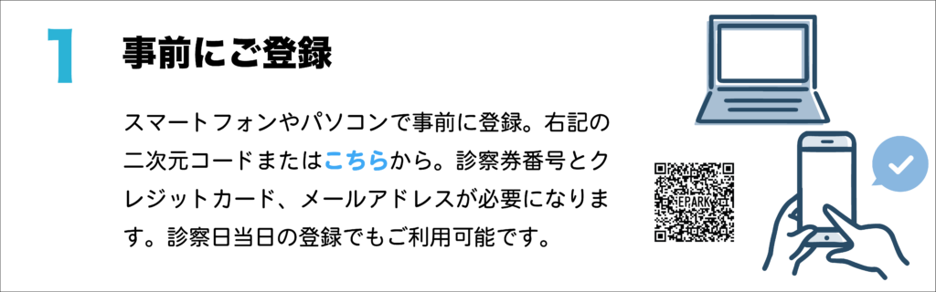 「診療費あと払いサービス」は、当日受診した診療費の会計を待たずにご帰宅いただけるサービスです。事前に利用登録を行っていただき、ご登録いただいたクレジットカードから、後日診療費が決済されます。本サービスは、利用登録後すぐに無料でご利用いただけます。