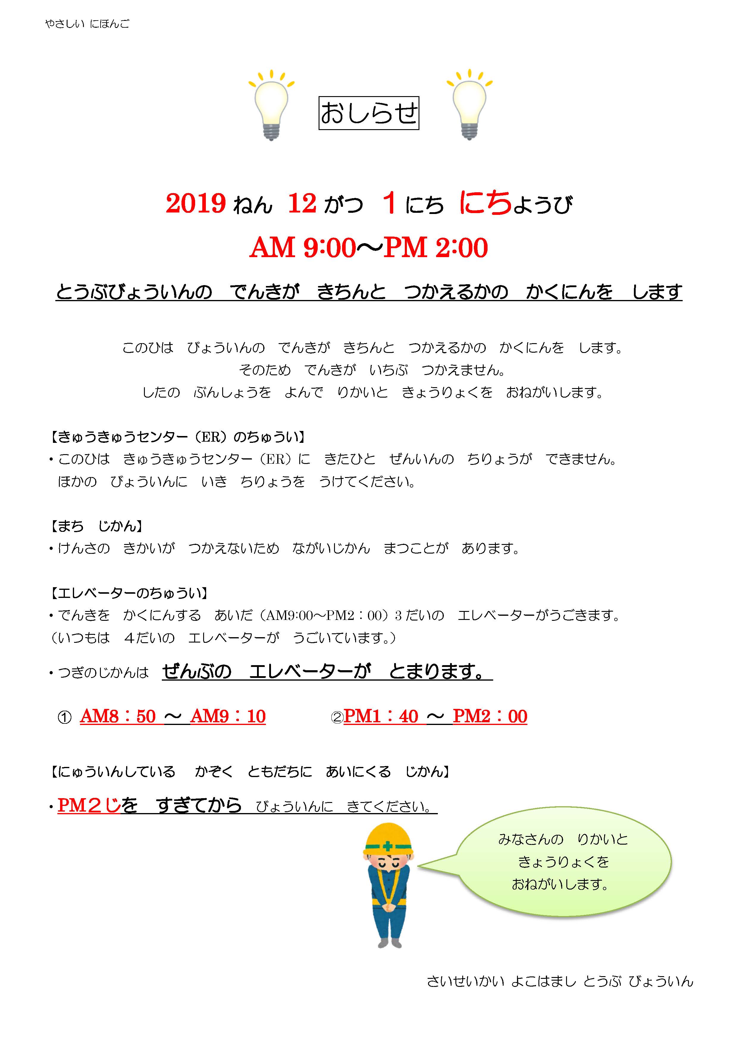 停電時間中はエレベーターの稼働が4台のところ3台運転になります。また、8:509:1013:4014:00の間は全てのエレベーターが停止します。面会・お見舞いはなるべく14:00以降にお越し下さるようご協力をお願い申し上げます。