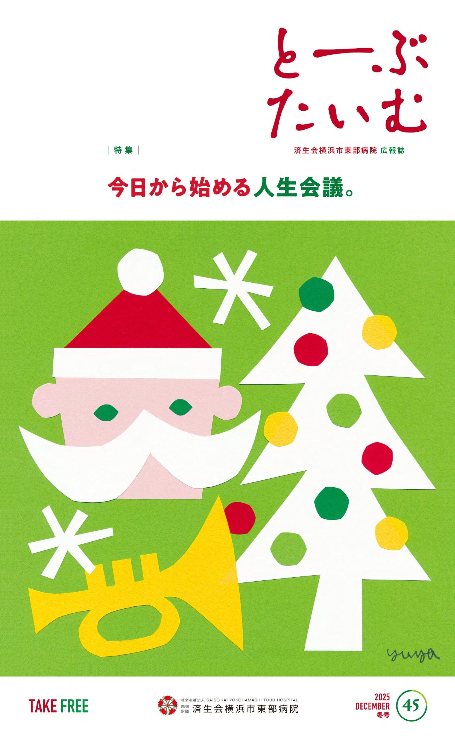 さて、クリスマスのモチーフが散りばめられた『とーぶたいむ vol.45』を発刊いたしました。赤い帽子と大きなヒゲが目印のサンタクロースが目を引き、トランペットのカラフルな音色の粒がツリーを飾る様子にクリスマスソングが聞こえてくるようです。