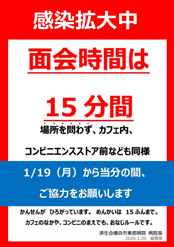 当院にて新型コロナウイルス感染症の陽性者が確認されたため、 院内感染防止を目的として、本日より当面の間、面会時間を以下の通り制限させていただきます。