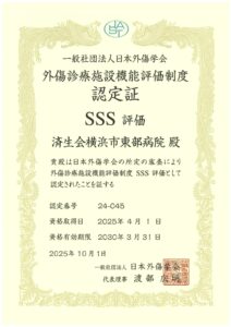 当院の救命救急センターは、一般社団法人日本外傷学会の外傷診療施設機能評価制度で最高ランクのSSS評価に2025年10月付で認定されました。